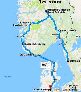 - Dag 2: Via de ferry Hirtshals-Kristiansand (Noorwegen) waar u overnacht, ca 300 km